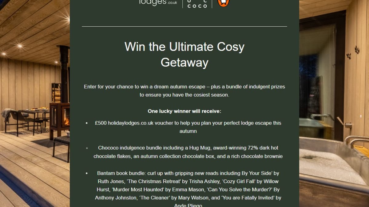 The grand prize includes a £500 holidaylodges.co.uk voucher for an autumn lodge escape. It also features an indulgent bundle with Chococo treats like a Hug Mug and hot chocolate, alongside a Bantam book bundle for cozy reading.