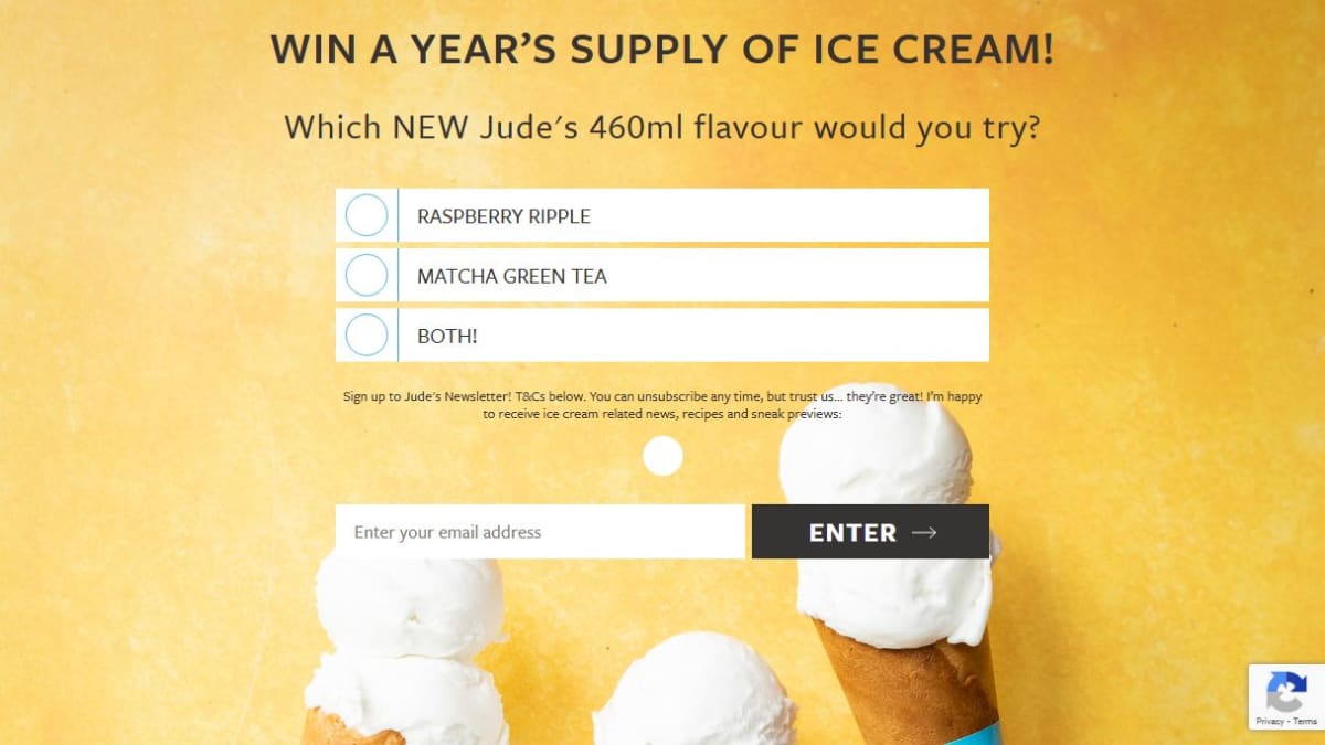 The prize consists of vouchers for a year's supply of Jude's Ice Cream, equating to 24 (2 tubs per month) of their 460ml tubs. These vouchers are redeemable at Sainsbury's, Tesco, and Waitrose.