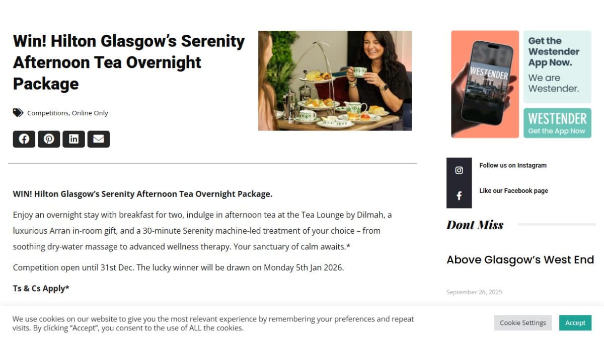 This package includes an overnight stay with breakfast for two at the Hilton Glasgow. Guests will also enjoy afternoon tea and receive a luxurious experiential gift, along with a 30-minute Serenity machine-led treatment.