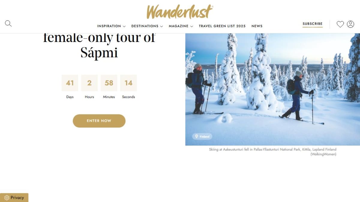 The prize is one complimentary spot on a seven-night Arctic Finland tour focusing on the Sápmi region and Sámi culture, departing in March 2026. Activities include chasing the northern lights, meeting reindeer herds, and options for cross-country skiing, snowshoeing, and husky mushing.