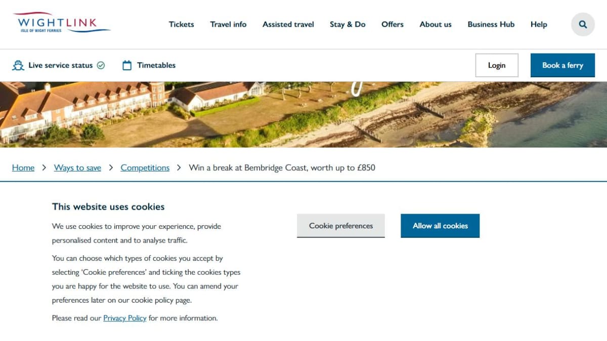 The winner receives a £600 accommodation voucher for Bembridge Coast, a Warner Hotel, valid for two adults sharing standard accommodation including breakfast and dinner. Additionally, the prize includes a £250 Wightlink Customer Service Voucher for ferry travel to the destination.