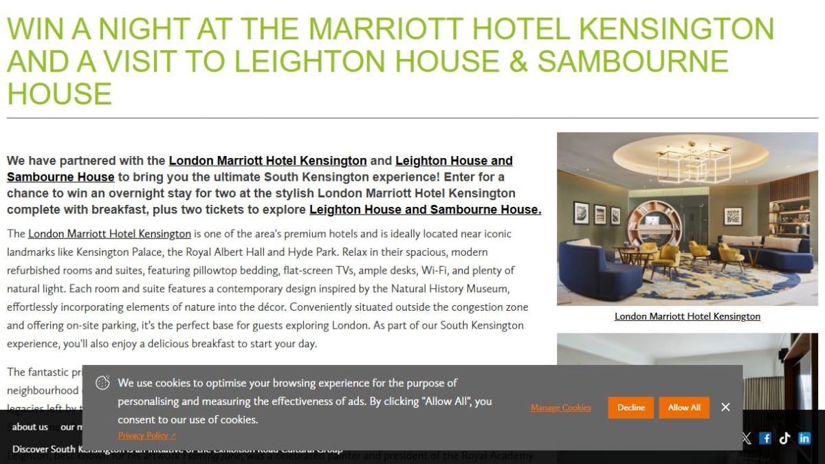 This prize includes an overnight stay for two people at the London Marriott Hotel Kensington, which also covers breakfast up to a value of £50. Additionally, the winner receives two tickets each to explore the historic Leighton House and Sambourne House.