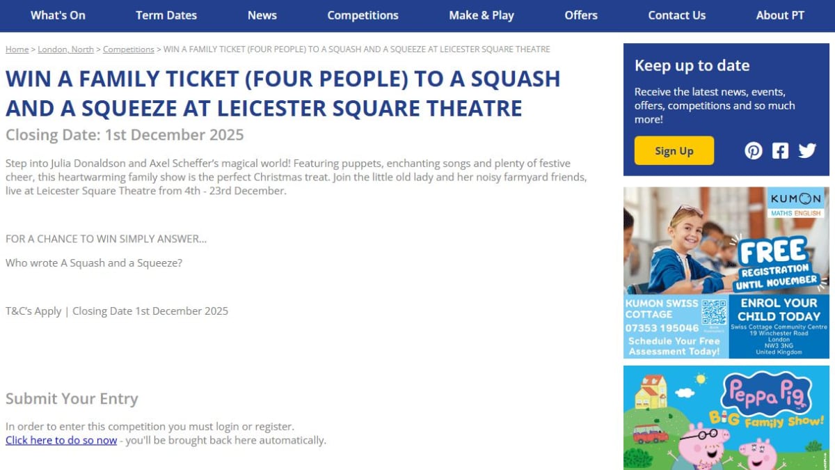 This entry awards a family ticket for four people to see the heartwarming show, A Squash and a Squeeze, at the Leicester Square Theatre. The performance features puppets, enchanting songs, and festive cheer.