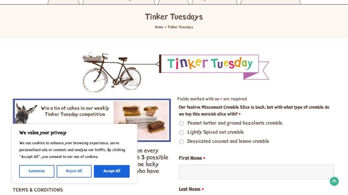 The prize is a tin containing cakes, specifically referencing a Mincemeat Crumble Slice product. No cash alternative is provided for this prize.
