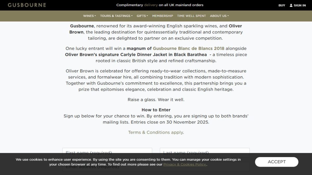 The prize includes a Magnum bottle of Gusbourne Blanc De Blancs 2018 sparkling wine. Additionally, the winner receives Oliver Brown’s Signature Carlyle Dinner Jacket in Black Barathea.