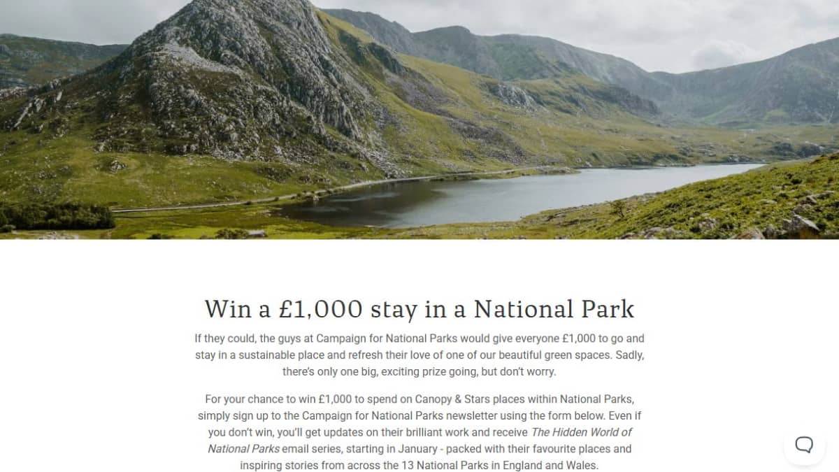 The winner will receive a £1,000 Canopy & Stars Gift Card. This prize is intended to be redeemed for accommodation within the National Park collection offered by Canopy & Stars.