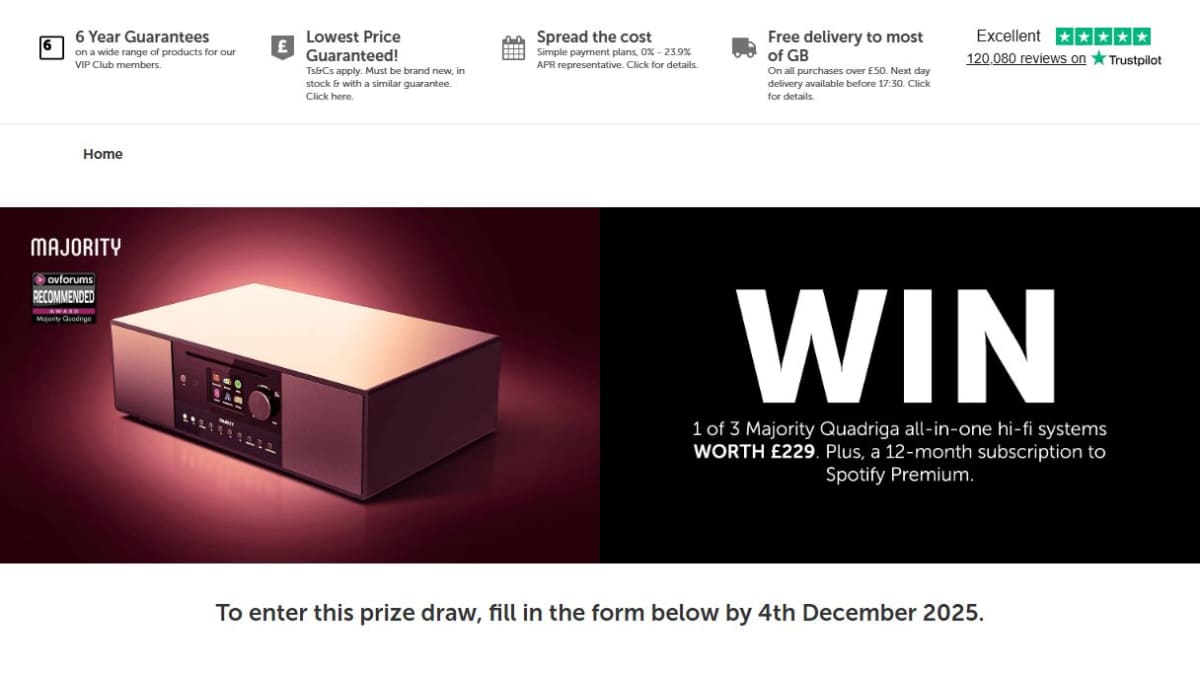 The prize includes a Majority Quadriga All-In-One Hi-Fi System. Winners will also receive a 12-month subscription to Spotify Premium to accompany the audio equipment.