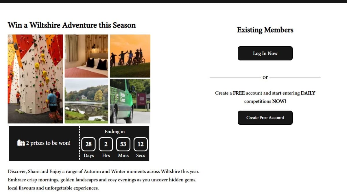 The main prize includes a 2-night stay for two at Riverbarn Kitchen B&B, 8 free climbs at The Arc Climbing Centre, and a half-day guided electric bike tour. A runner-up prize includes entry tickets to Stourhead National Trust and free rides on Wiltshire Connect.