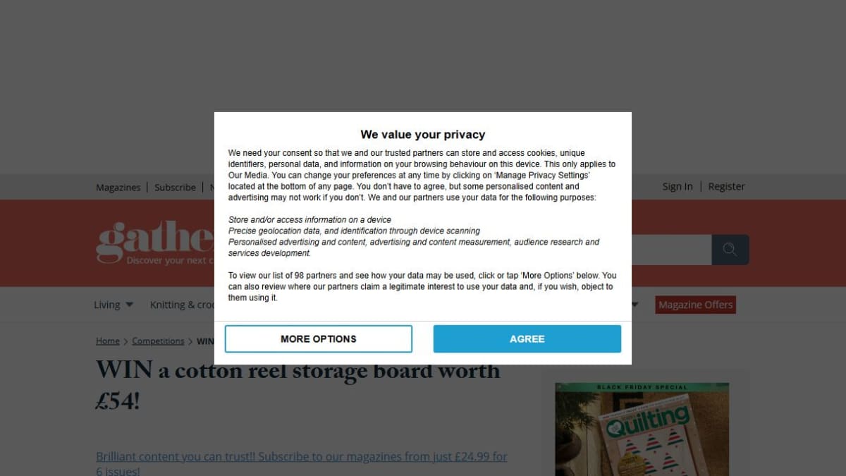 This prize is a medium-sized cotton reel storage board in a white colorway, designed to hold and display over 75 threads. It helps keep a sewing space organized and satisfies the need for accessible thread storage.