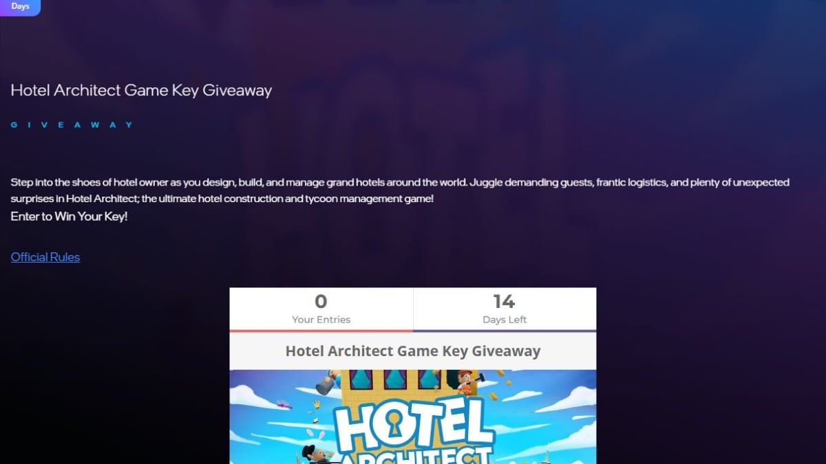 This prize is a game key for 'Hotel Architect', a simulation and tycoon management game. Players step into the role of a hotel owner to design, build, and manage luxury hotels globally while handling logistics and unexpected events.