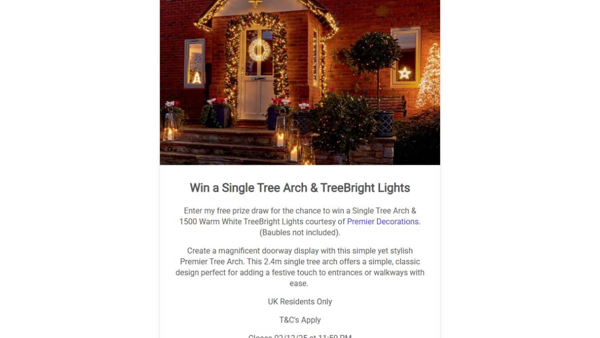 This prize includes a large 2.4-meter single tree arch structure. It is paired with a significant set of 1500 warm white Treebright lights for bright outdoor illumination.