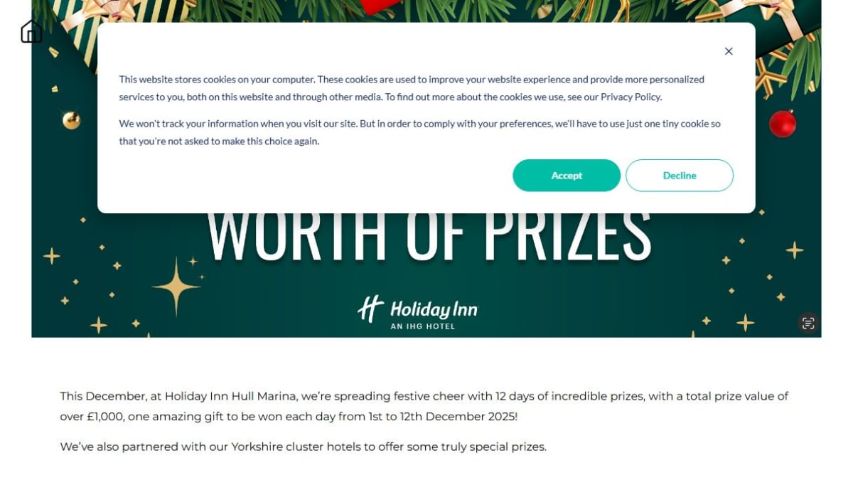 This promotion features twelve different prizes centered around experiences at or related to the Holiday Inn Hull Marina and associated venues. Prizes include dining vouchers, an overnight stay, event tickets, and free parking.