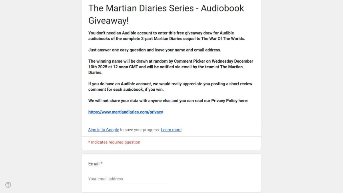 This prize is the complete Audible series for the audio sequel to The War of The Martian Diaries. This offers access to an entire narrated book series.