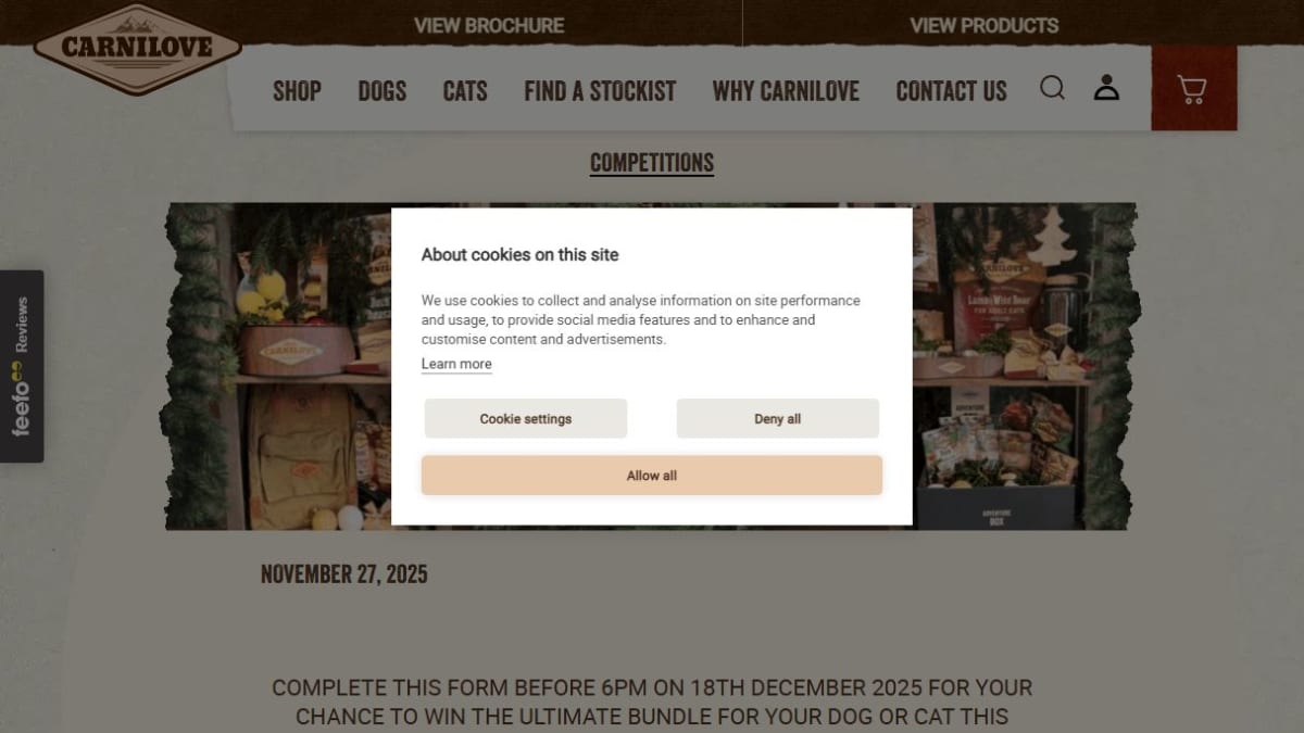The prize is split between two winners: one receives a comprehensive dog bundle including food, a Fjällräven rucksack, treats, a bowl, lead, toy, and merchandise. The second winner receives a premium cat bundle featuring food, an adventure box playground, treats, a bowl, toy, and merchandise.
