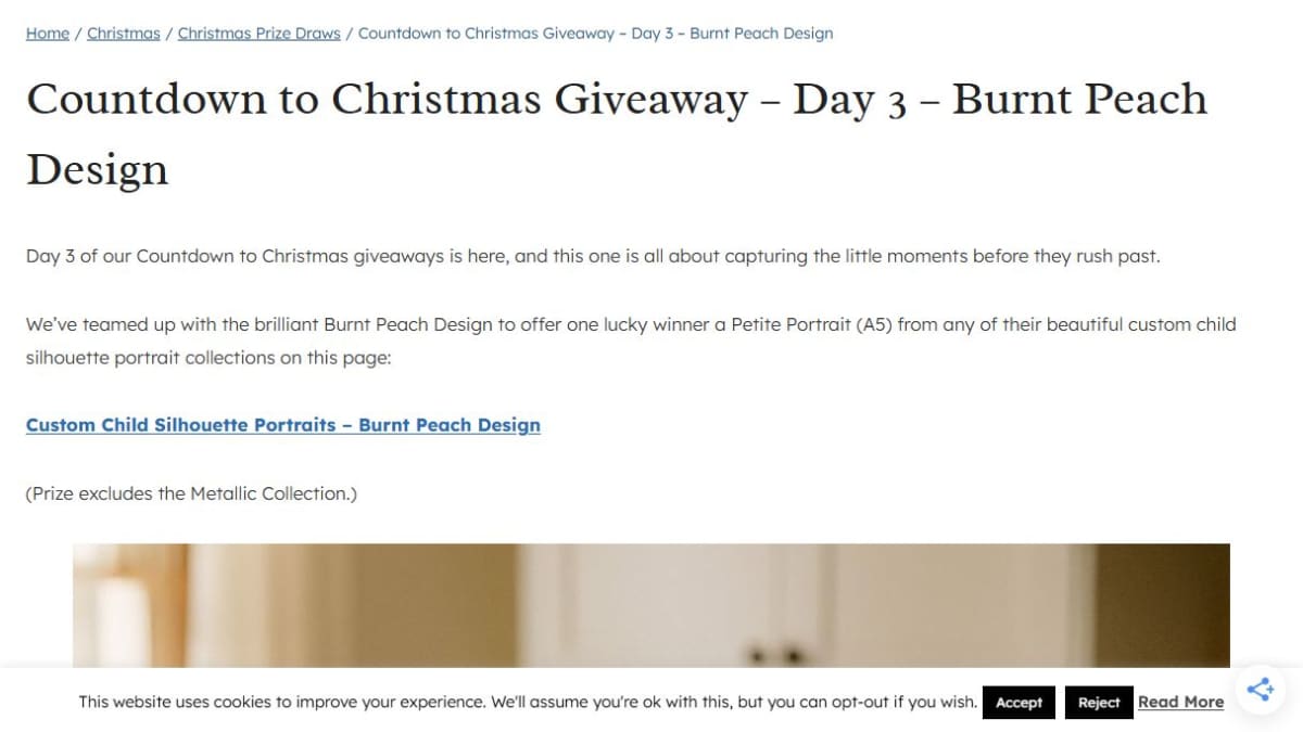 The winner receives a Petite Portrait (A5 size) created via custom child silhouette from Burnt Peach Design. This personalized artwork is hand-drawn by an artist based on a provided photo, offering a meaningful keepsake style.