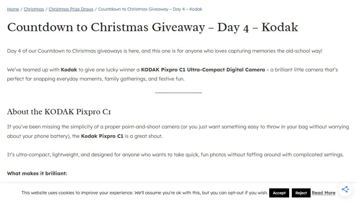This prize is a brilliant little KODAK PIXPRO C1 Ultra-Compact Digital Camera, perfect for snapping everyday moments and family gatherings. It features a 13MP BSI CMOS Sensor and 4X optical zoom in a lightweight, easy-to-carry design.