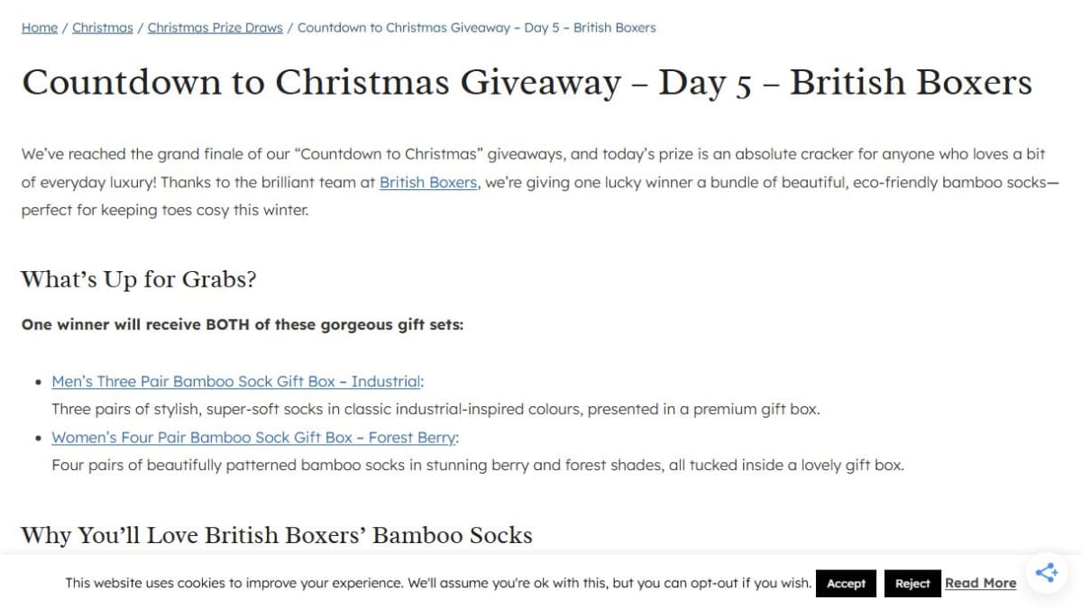 The prize consists of two beautiful, eco-friendly bamboo sock gift sets from British Boxers. These socks are naturally breathable, antibacterial, and designed for comfortable, all-day wear.