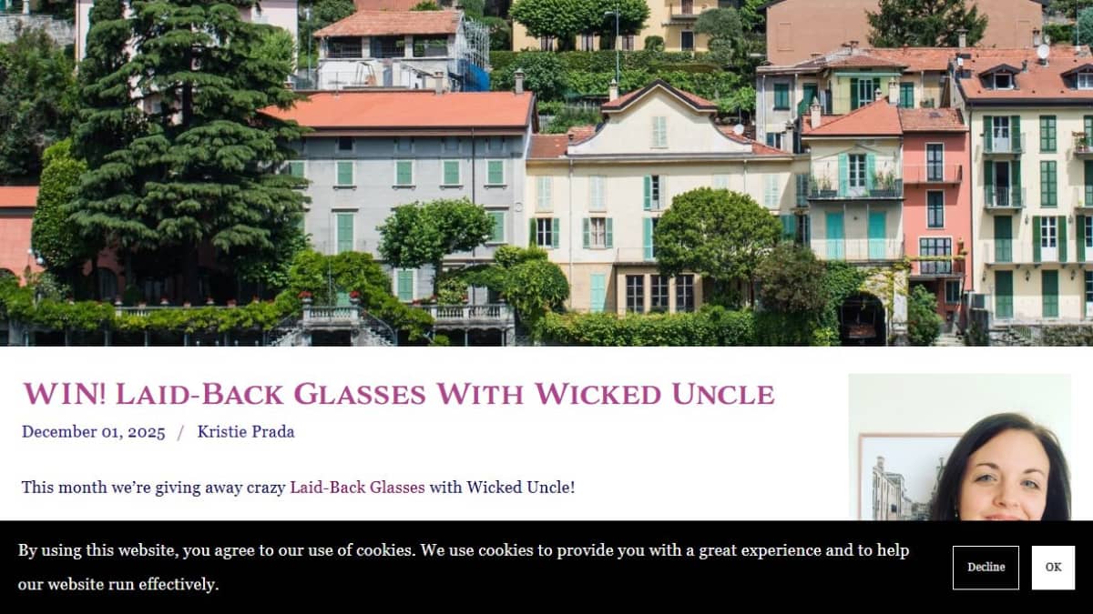 This giveaway features a pair of Laid-Back Glasses, a gadget designed for comfortable viewing while lying flat. The prism lenses redirect the view 90 degrees, allowing you to read or use a phone without lifting your head.