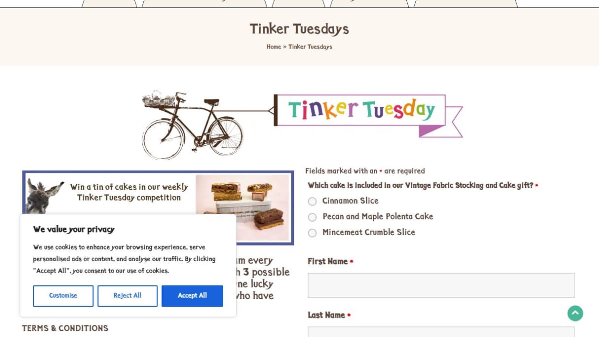 The prize is a tin filled with various cakes. The competition associated with this prize is a weekly Tinker Tuesday draw that runs for 24 hours.