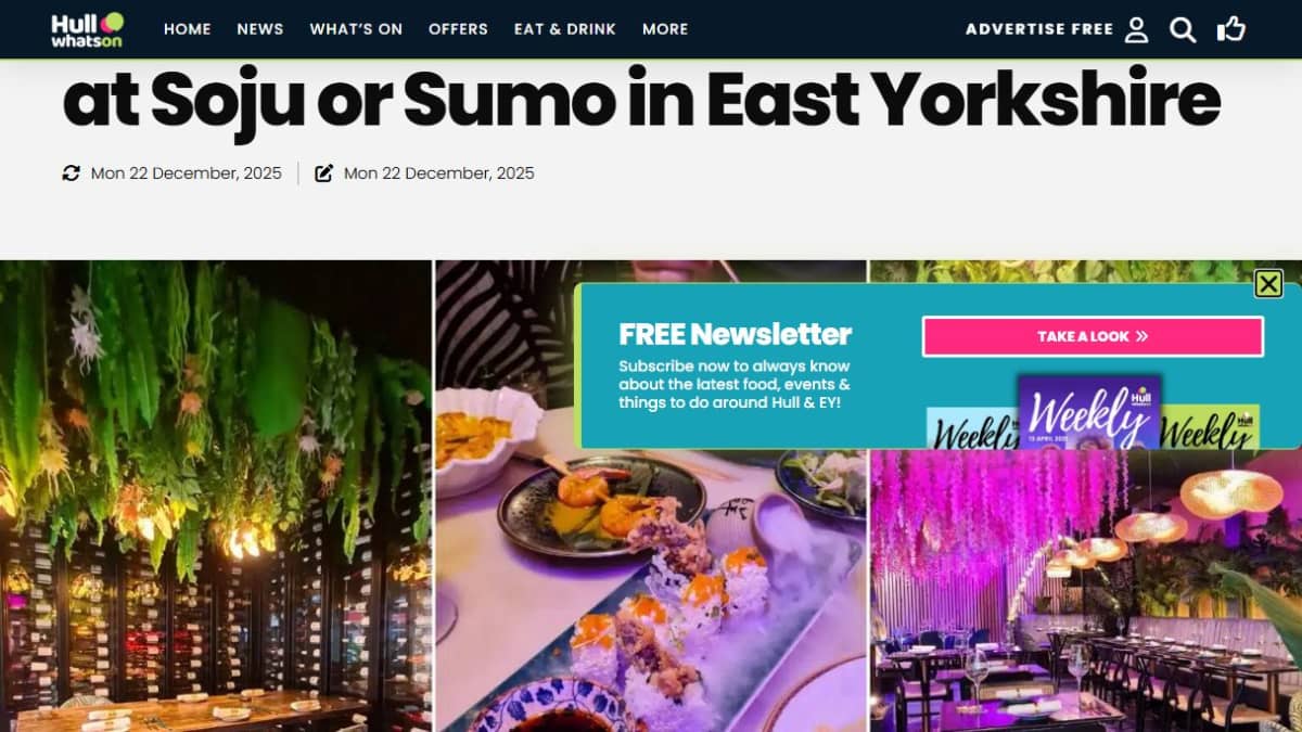 The winner receives a complimentary meal for four individuals, which includes one drink for each person. This experience can be redeemed at either the Soju or Sumo restaurant locations situated in East Yorkshire.