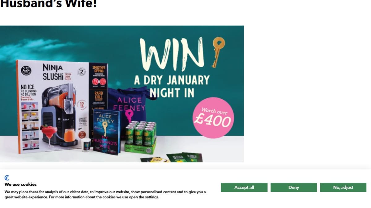 This prize pack is designed for ultimate relaxation and sophistication, featuring a Ninja Slushy Machine, a signed hardcover of 'My Husband's Wife' by Alice Feeney, and a selection of Belvoir Farm mocktails. The main prize also includes an exclusive tote bag, scented candle, bookmark, audiobook code, and recipe card.