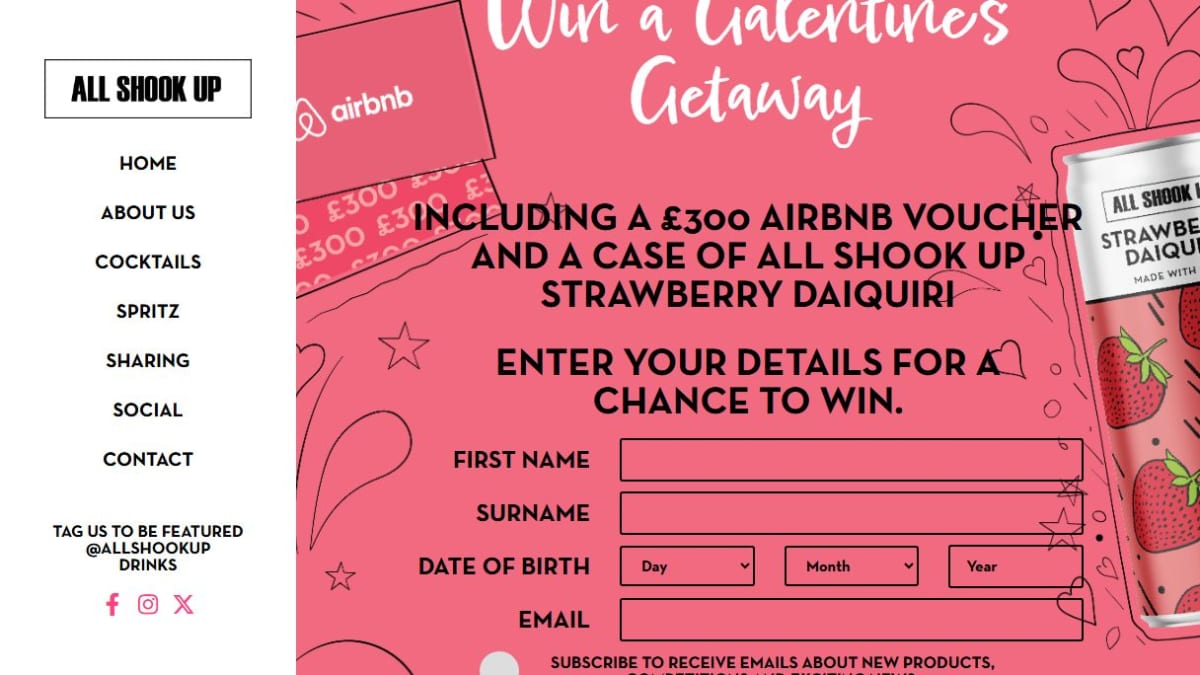 The grand prize includes an Airbnb voucher valued at £300. Additionally, the winner receives a case of 'All Shook Up Strawberry Daiquiri' cocktails.
