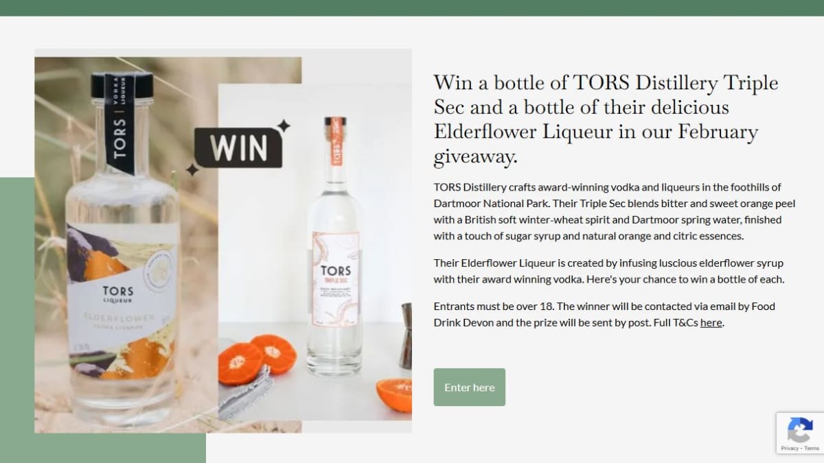 This prize includes two bottles of spirits crafted by Tors Distillery, featuring a Triple Sec made with bitter and sweet orange peel, and an Elderflower Liqueur infused with award-winning vodka.