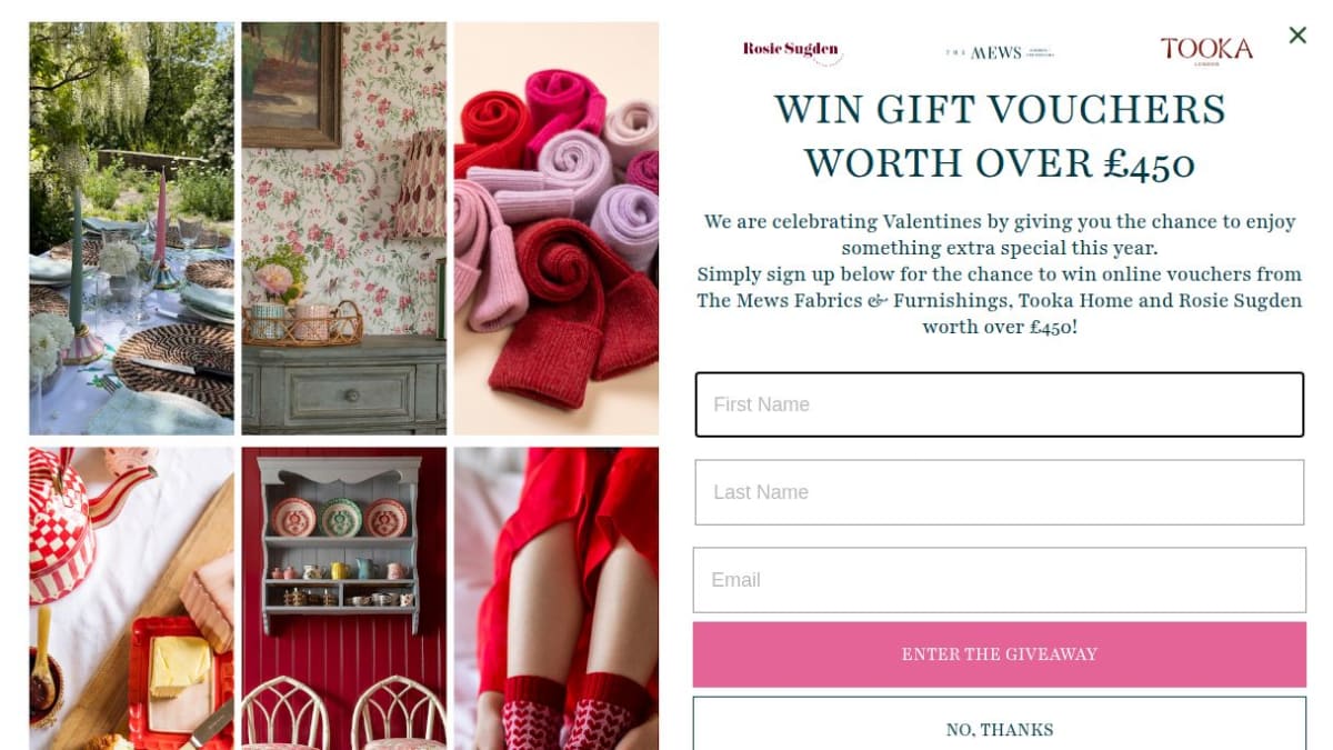 This prize consists of three separate online vouchers, each valued at £150. The vouchers are designated for use at The Mews Fabrics & Furnishings, Tooka homeware, and Rosie Sugden Scottish Cashmere.