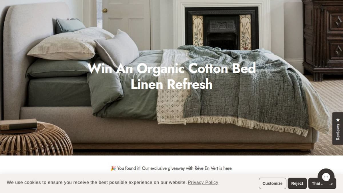 This prize is a 100% GOTS-certified Washed Organic Cotton Bed Linen Set, available up to Superking size. The linen is described as soft, breathable, skin-friendly, and free from harsh chemicals.