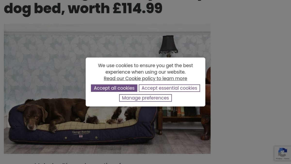 This prize is a large George Barclay Country Dog sofa bed, measuring 120 x 75 x 27cm and finished in midnight blue. It features a contemporary design inspired by country fashion, with options for orthopaedic or memory topper mattresses to aid the dog's wellbeing.