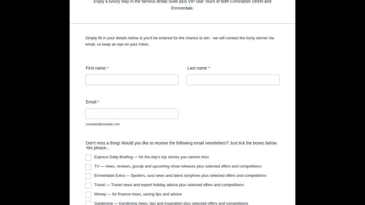 The prize includes a two-night stay for two people in the Grand Suite (Corriedale Bridal Suite) at The Saddleworth Hotel from Friday to Sunday. It also covers breakfast for two on Saturday and Sunday, plus two tickets each for the Coronation Street Experience Star Tour and the Emmerdale Village Tour.