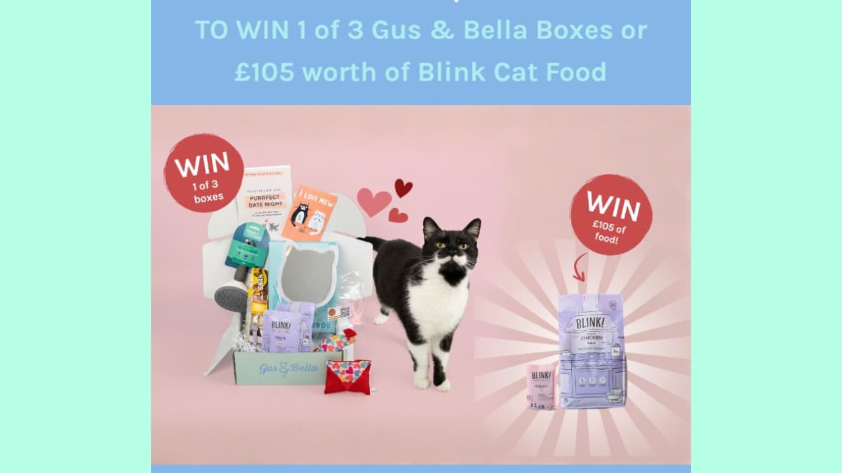 The prize offers a choice between receiving a Gus & Bella Box or obtaining £105 worth of Blink Cat Food. This competition focuses on premium pet supplies, likely offering high-quality curated items or a substantial food supply for cats.