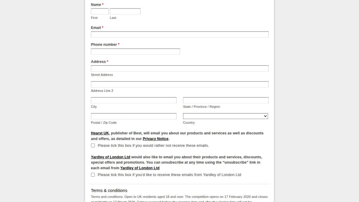 The prize is a fragrance collection from Yardley featuring the 'Lily of the Valley' scent. This bundle includes an Eau de Toilette, Body Wash, Hand Cream, Body Spray, and Body Lotion.