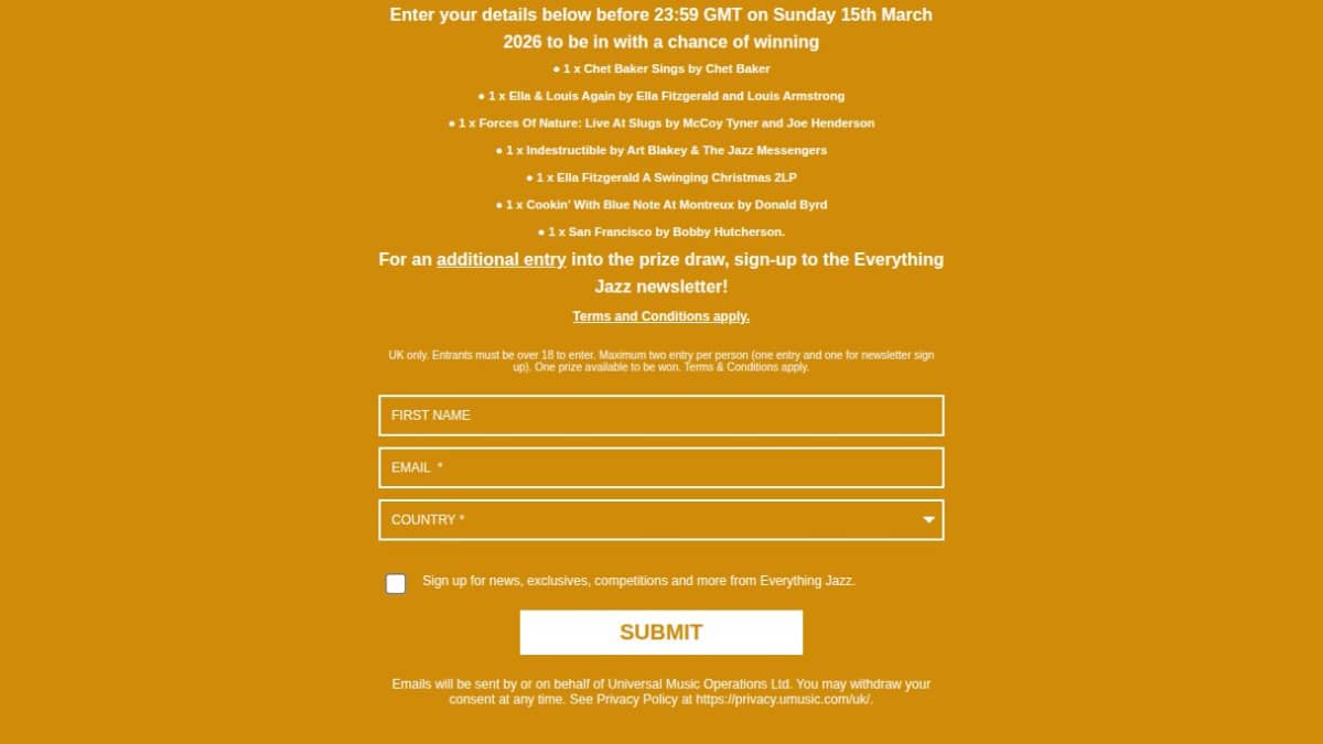 This prize package includes seven classic jazz albums on vinyl. Featured artists include Chet Baker, Ella Fitzgerald, Louis Armstrong, and Art Blakey.