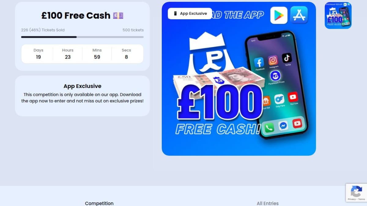 This prize is £100 awarded as free cash to one lucky winner. The draw occurs once the specified number of entries is reached.