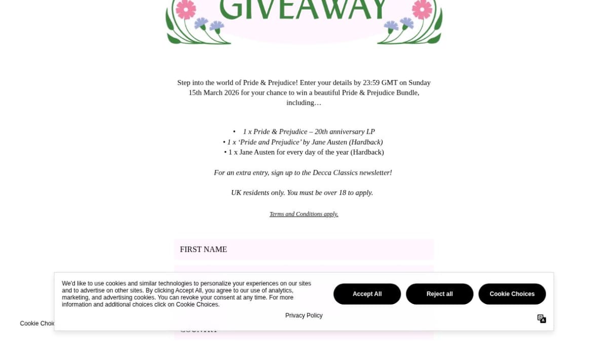 This prize package celebrates Pride & Prejudice and includes the 20th-anniversary vinyl LP of the film's music. It also contains two hardback books: the classic novel by Jane Austen and a daily quote book, 'Jane Austen for every day of the year'.