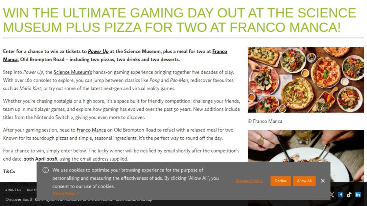 This prize includes two tickets to the 'Power Up' hands-on gaming experience at the Science Museum, featuring over 160 consoles. Following the session, the winner receives a meal for two at Franco Manca, which covers two pizzas, two drinks, and two desserts.