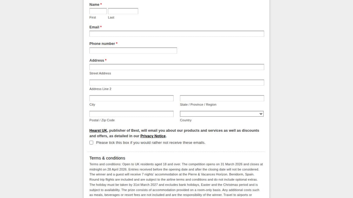 The winner and a guest will receive 7 nights' accommodation at the Pierre & Vacances Horizon in Benidorm, Spain, including round-trip flights. The holiday must be taken by March 31st, 2027, and is provided on a room-only basis.