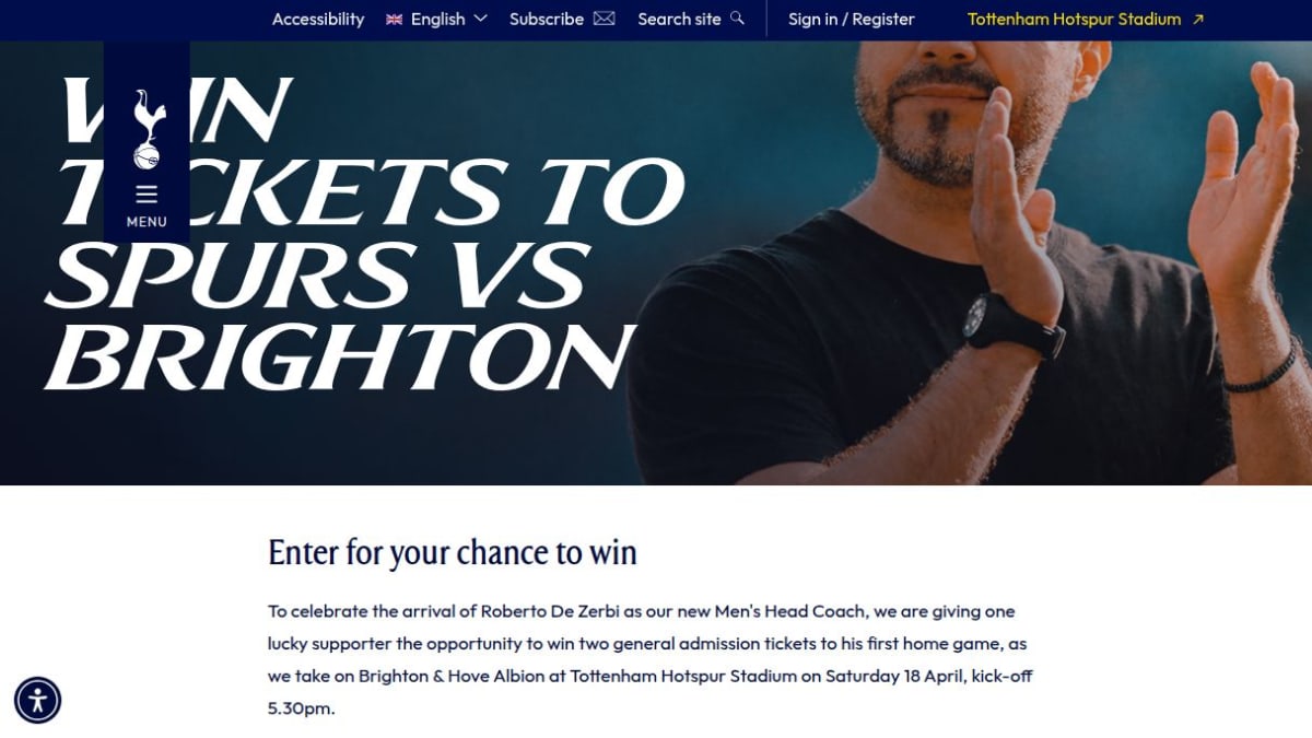 Two general admission tickets are offered to a lucky supporter for the home game where Tottenham Hotspur plays against Brighton & Hove Albion. The match celebrates the arrival of the new Men's Head Coach.