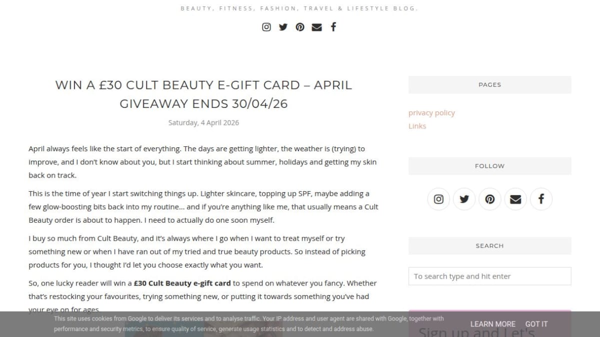 One lucky reader will win a £30 Cult Beauty e-gift card to spend on beauty products. This can be used for restocking favorites, trying new items, or purchasing desired skincare.