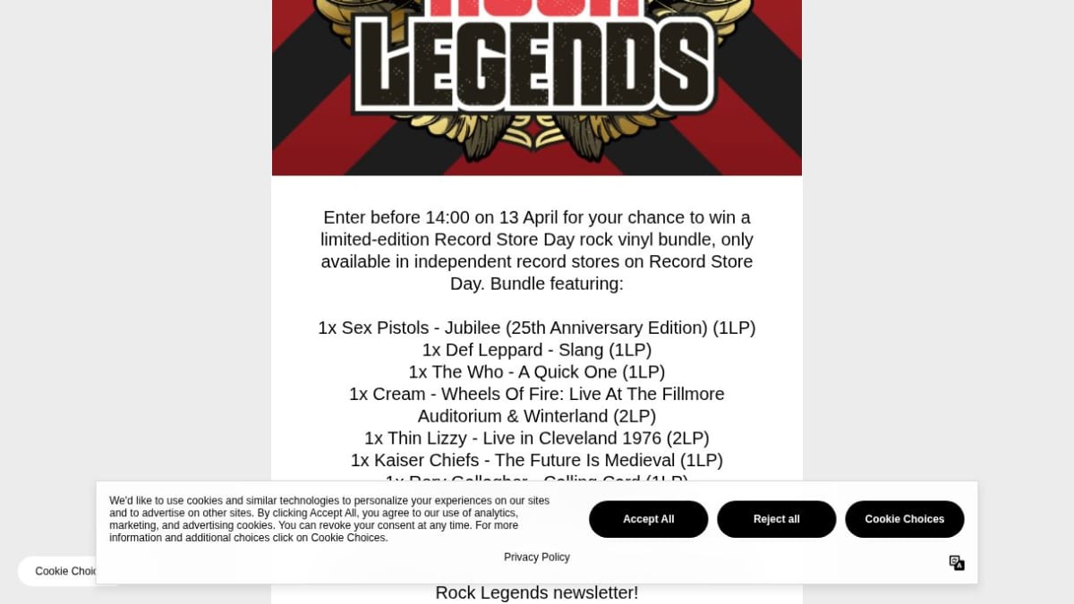 This prize is a limited-edition vinyl bundle featuring nine different albums from artists like Sex Pistols, Def Leppard, and The Who. The collection includes several single LPs and double LPs, released specifically for Record Store Day.