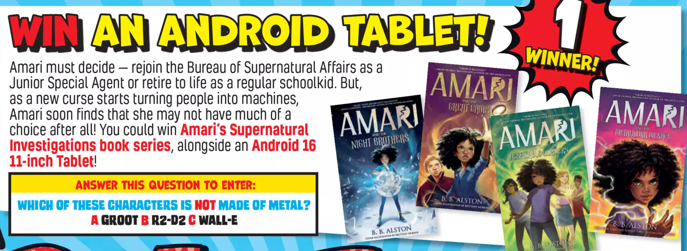 The prize includes a new Android tablet paired with a bundle of kids' books, specifically mentioning Beano Issue 4326. This combination offers both technology and reading material for children.