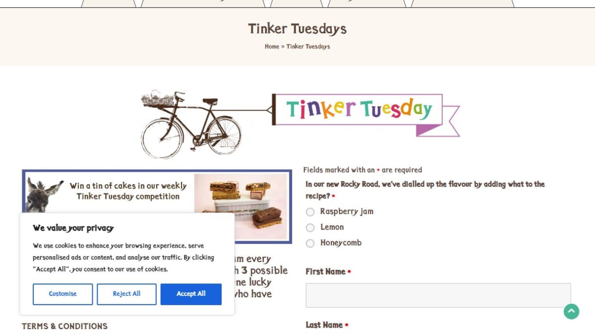 The prize is a tin containing assorted cakes from Honeybuns. The competition focuses on a specific flavor enhancement in their Rocky Road recipe.