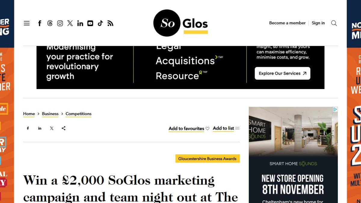 The prize includes a £2,000 marketing campaign with SoGlos, featuring display advertising and content marketing services. Additionally, the winner receives a team night out for 12 people at The Brewery Quarter, including cocktails, a buffet meal, and social darts.