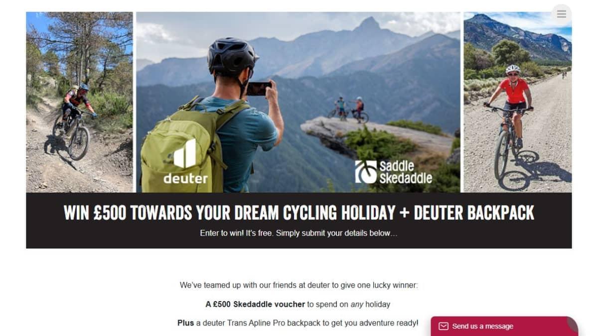 This prize includes a £500 voucher for a Skedaddle holiday, redeemable on any of their trips, and a deuter Trans Alpine Pro backpack. The voucher can be used for bookings between November 2025 and November 2026.