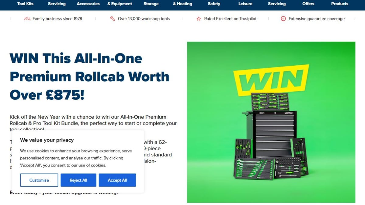 This prize includes an 8-drawer rollcab from the Sealey Premium line, bundled with various professional tools. It is designed to offer comprehensive solutions for automotive, construction, and agricultural tasks.