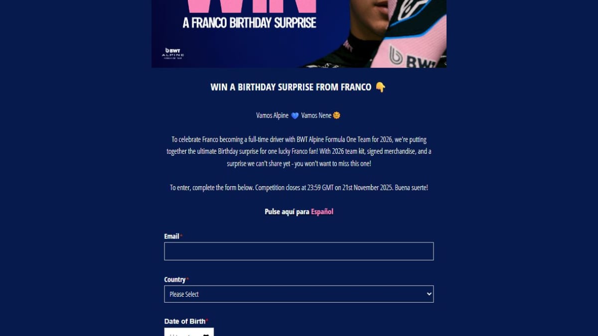 This ultimate birthday surprise includes the 2026 BWT Alpine Formula One Team kit and various pieces of signed merchandise. The prize is intended to celebrate Franco's promotion to a full-time driver for the Alpine team in 2026.