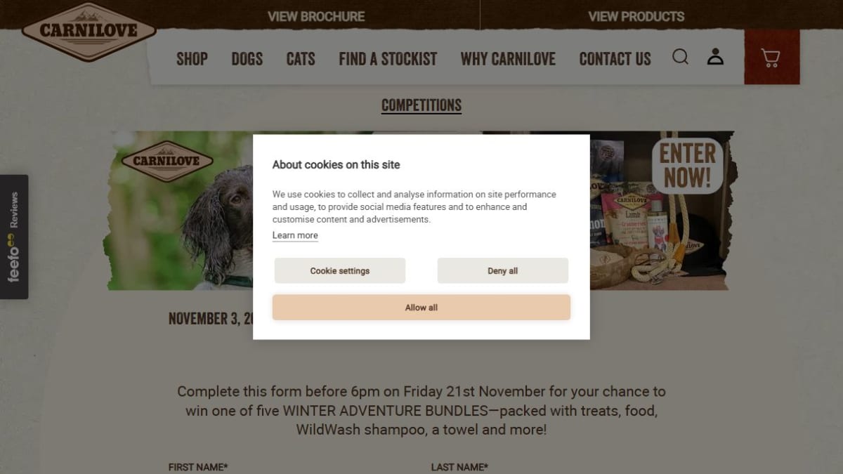 This prize package includes Carnilove treats, food, a lead, bowl, socks, caps, a towel, and Wild Wash shampoo. Five separate winners will each receive one of these comprehensive adventure bundles.