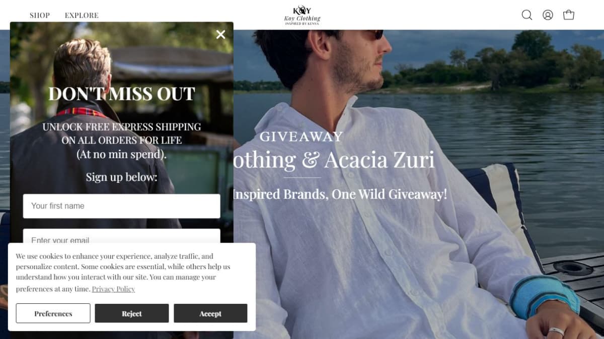 The prize consists of a Safari Silk Scarf from Acacia Zuri and a Linen Shirt from Koy Clothing. Both items allow the winner to select a design of their preference.