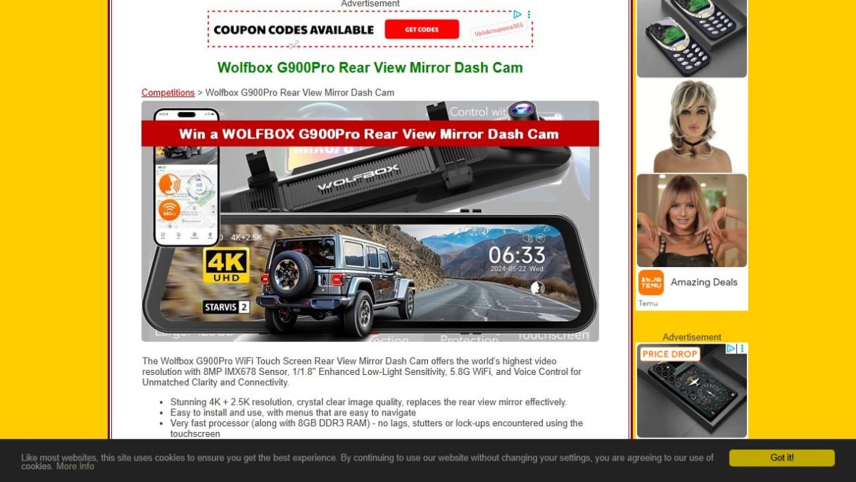 This prize includes the Wolfbox G900Pro mirror-style dash cam featuring 4K front and 2.5K rear cameras. It integrates a touchscreen display into the existing rear-view mirror and comes with a hardwire kit.